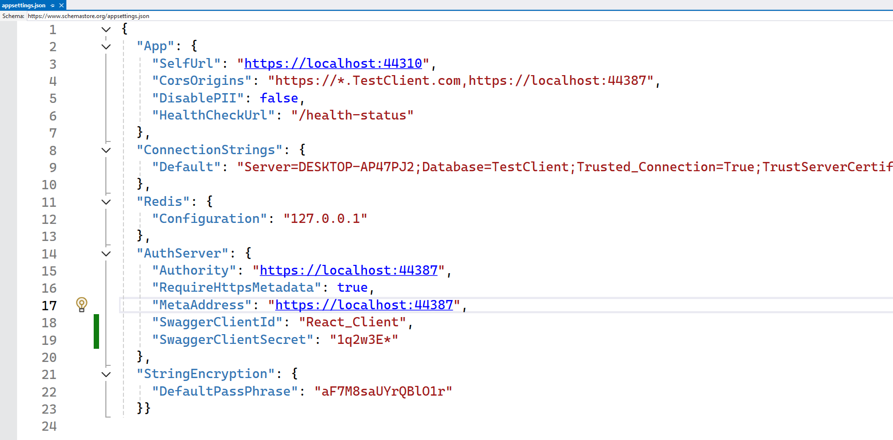 "AuthServer": { "Authority": "https://localhost:44387", "RequireHttpsMetadata": true, "ApiName": "ReactAppService" }