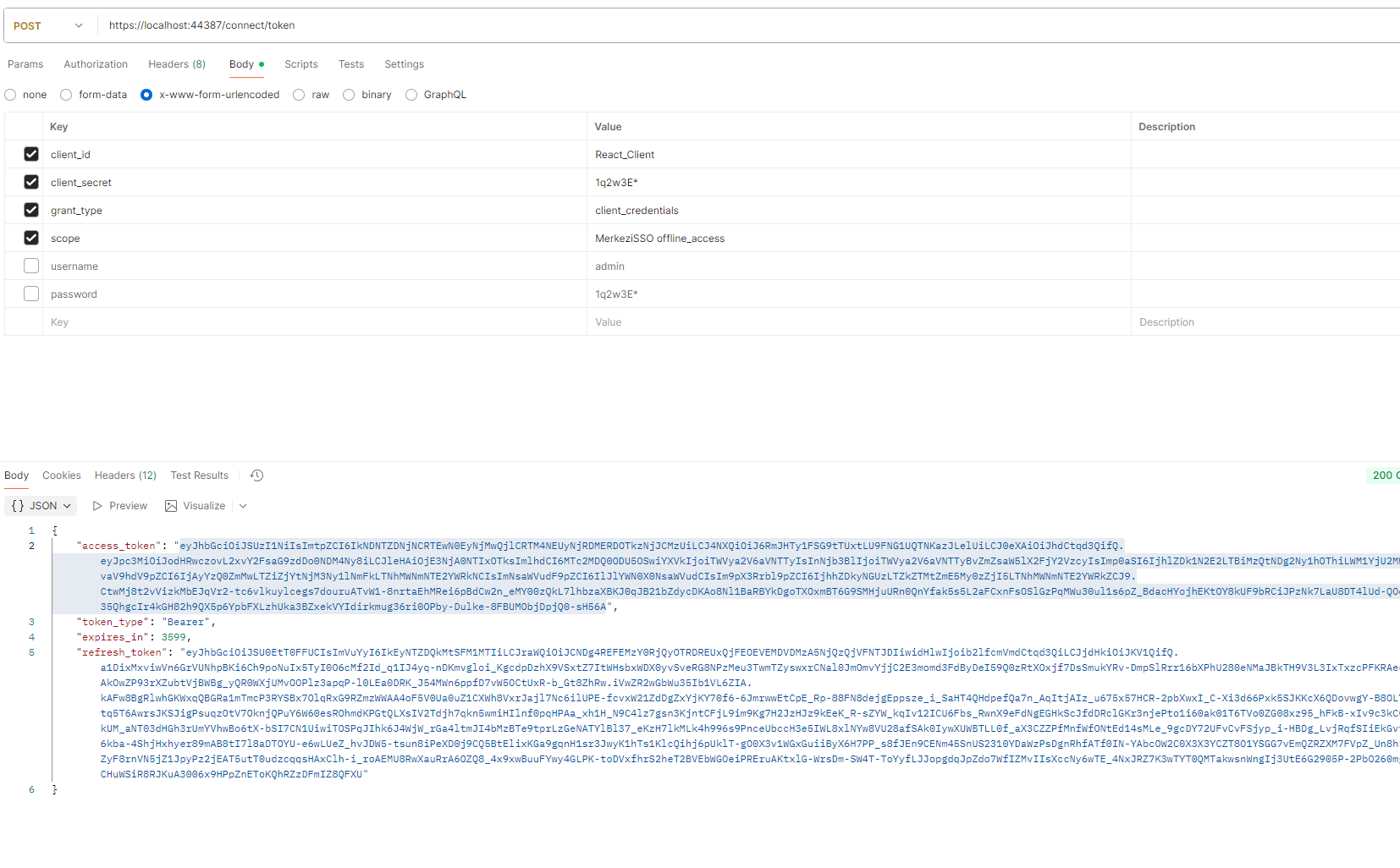 POST /connect/token client_id=React_Client client_secret=1q2w3E* grant_type=client_credentials scope=ReactAppService offline_access