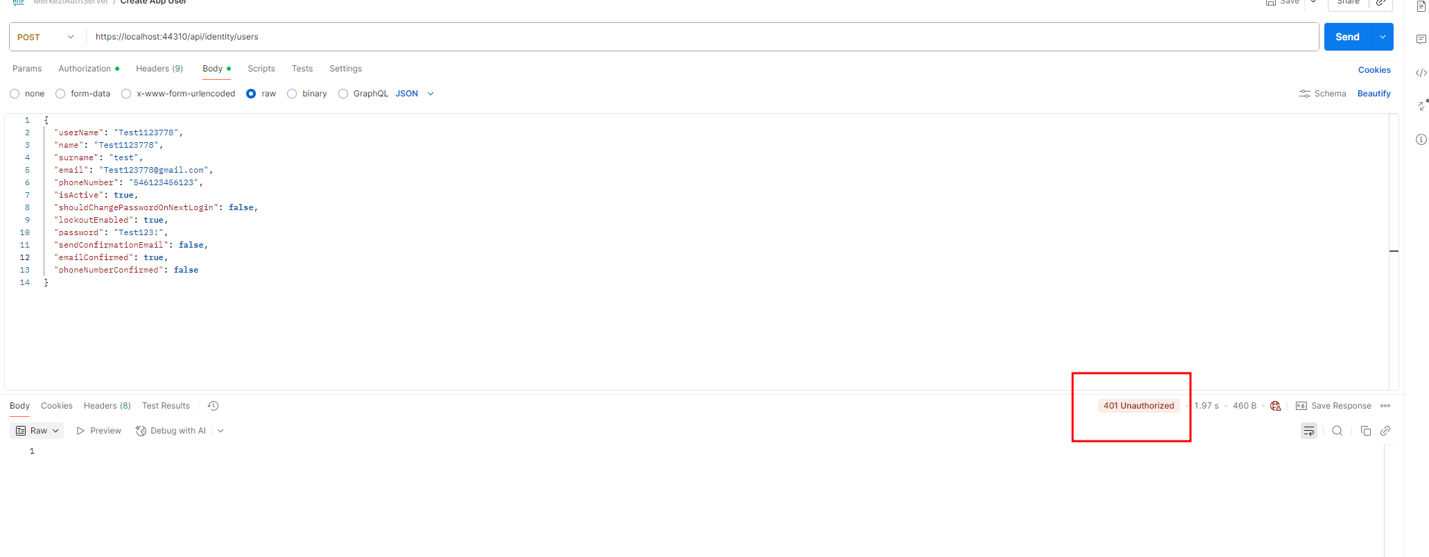 However, when we try to get a token via Postman and call the /api/identity/users POST method, we receive an authorization error.