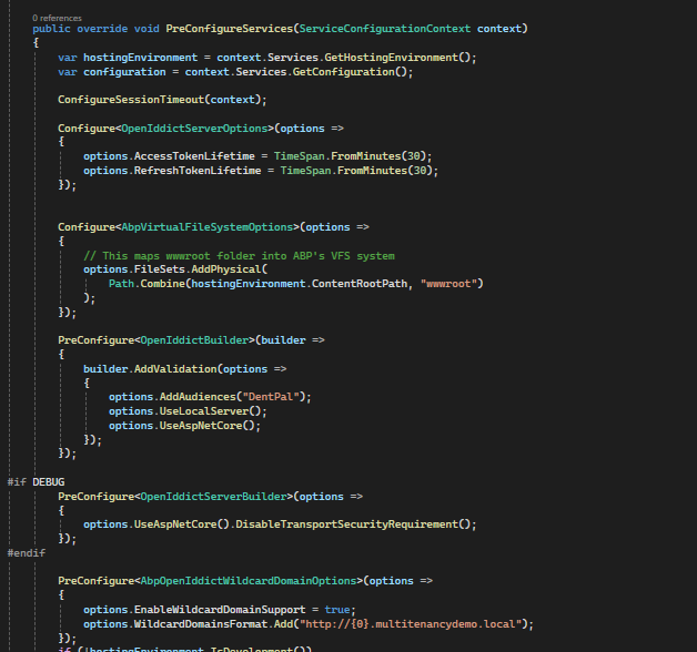 [DependsOn( typeof(NTIDemoDomainModule), typeof(AbpPermissionManagementEntityFrameworkCoreModule), typeof(AbpSettingManagementEntityFrameworkCoreModule), typeof(AbpBackgroundJobsEntityFrameworkCoreModule), typeof(AbpAuditLoggingEntityFrameworkCoreModule), typeof(AbpFeatureManagementEntityFrameworkCoreModule), typeof(AbpIdentityProEntityFrameworkCoreModule), typeof(AbpOpenIddictProEntityFrameworkCoreModule), typeof(LanguageManagementEntityFrameworkCoreModule), typeof(FileManagementEntityFrameworkCoreModule), typeof(SaasEntityFrameworkCoreModule), typeof(ChatEntityFrameworkCoreModule), typeof(TextTemplateManagementEntityFrameworkCoreModule), typeof(AbpGdprEntityFrameworkCoreModule), typeof(BlobStoringDatabaseEntityFrameworkCoreModule) )] public class NTIDemoEntityFrameworkCoreModule : AbpModule { public override void PreConfigureServices(ServiceConfigurationContext context) { // https://www.npgsql.org/efcore/release-notes/6.0.html#opting-out-of-the-new-timestamp-mapping-logic