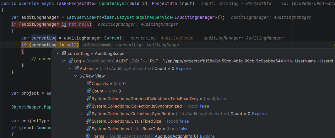 It is a method in my app service. When I inject IAuditingManager, I see that it does not have the current action. I only see the possibility of adding information as extra properties in the log.