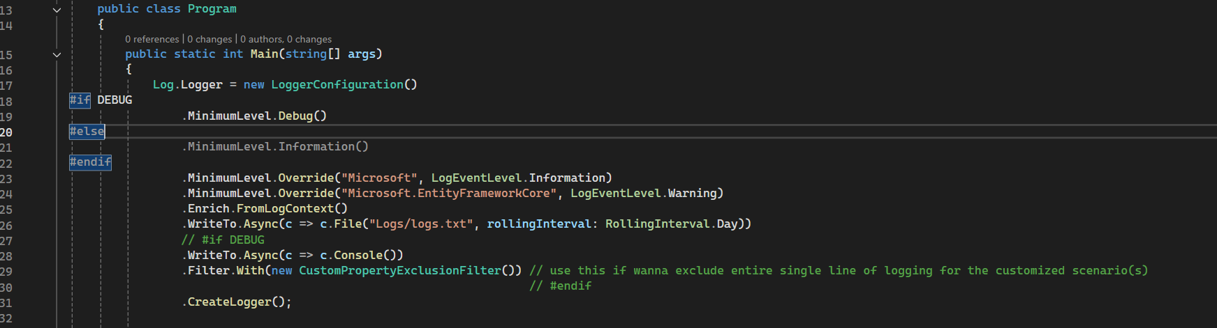 .MinimumLevel.Debug()everywhere.var loggerConfiguration = new LoggerConfiguration() .MinimumLevel.Debug() .MinimumLevel.Override("Microsoft.EntityFrameworkCore", LogEventLevel.Warning) .Enrich.FromLogContext() .WriteTo.Async(c => c.File("Logs/logs.txt"))Thanks