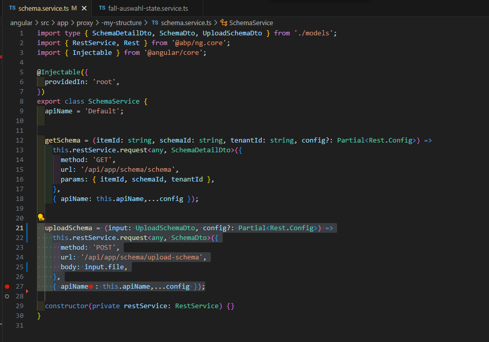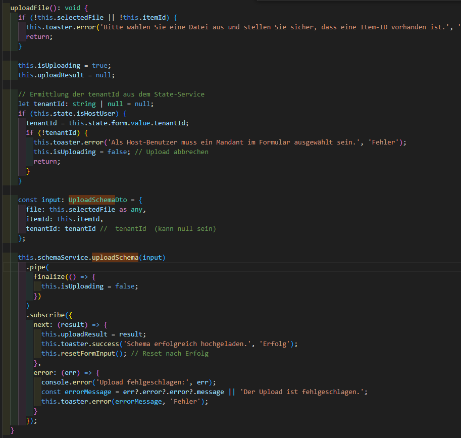 with that "import { ToasterService } from '@abp/ng.theme.shared'; import { Component, Input } from '@angular/core'; import { SchemaDto, SchemaService, UploadSchemaDto } from '@proxy/-my-structure'; import { FallAuswahlStateService } from '../fall-auswahl/fall-auswahl-state.service'; import { finalize } from 'rxjs';