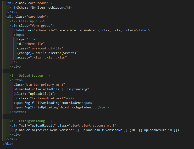 "<div class="card"> <div class="card-header"> <h3>Schema für Item hochladen</h3> </div> <div class="card-body"> <!-- File-Input --> <div class="form-group"> <label for="schemaFile">Excel-Datei auswählen (.xlsx, .xls, .xlsm)</label> <input type="file" id="schemaFile" class="form-control-file" (change)="onFileSelected($event)" accept=".xlsx, .xls, .xlsm" /> </div>