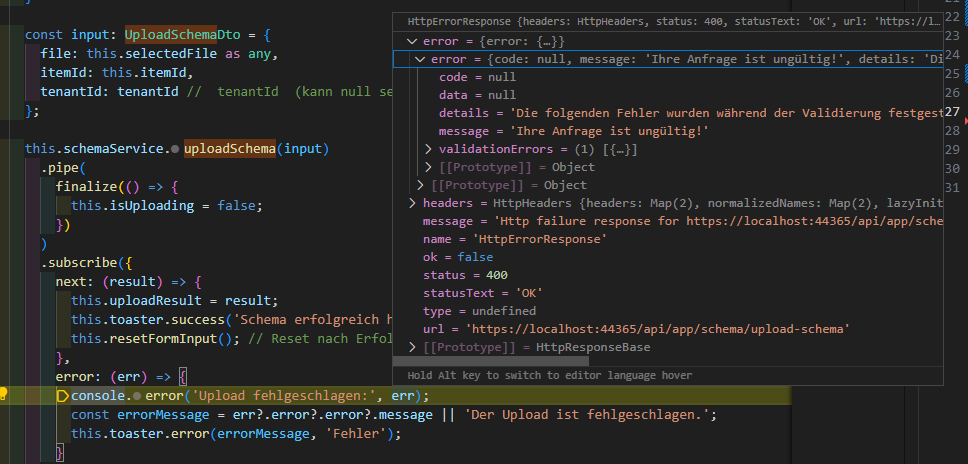 this.schemaService.uploadSchema(input) .pipe( finalize(() => { this.isUploading = false; }) ) .subscribe({ next: (result) => { this.uploadResult = result as any; this.toaster.success('Schema erfolgreich hochgeladen.', 'Erfolg'); this.selectedFile = null; }, error: (err) => { console.error('Upload fehlgeschlagen:', err); this.toaster.error('Der Upload ist fehlgeschlagen.', 'Fehler'); } }); }