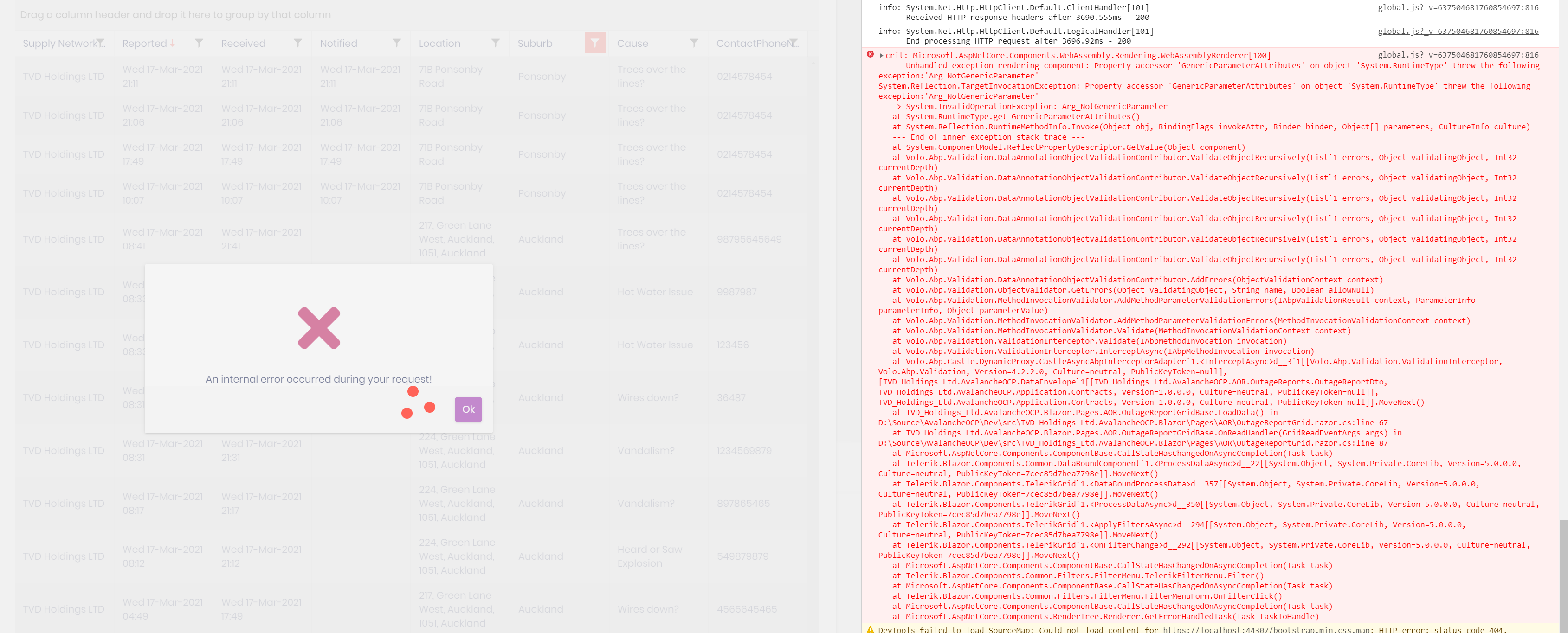 public class OutageReportDto : AuditedEntityDto<int>, IMultiTenant { public Guid? TenantId { get; set; } public int SupplyNetworkId { get; set; } public string SupplyNetworkName { get; set; } public DateTime RecordedTime { get; set; } public string Location { get; set; } public string Suburb { get; set; } public int CauseId { get; set; } public string CauseName { get; set; } public string ContactPhoneNumber { get; set; } public double LatitudeReporter { get; set; } public double LongitudeReporter { get; set; } public double LatitudeLocator { get; set; } public double LongitudeLocator { get; set; } public DateTime? NotifiedTime { get; set; } public new DateTime CreationTime { get; set; } }Notice, if I change the grid to Client-Side filter, where I just call a service method with no parameters to return a complete List<OutageReporterDto>, it works fine. So, I don't think that there's an issue with my grid or my Dto class. The problem is only when calling the service method with a parameter type DataSourceRequest and there is a Filter item in this object. If there is no filter items the method works fine.