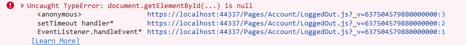 The error originates from this line in LoggedOut When looking through the html I am unable to find any button with this ID and its clearly not visible on the page. The button is however present on our production environemt currently running Abp v3.3.3. What could have resulted in this button being removed?