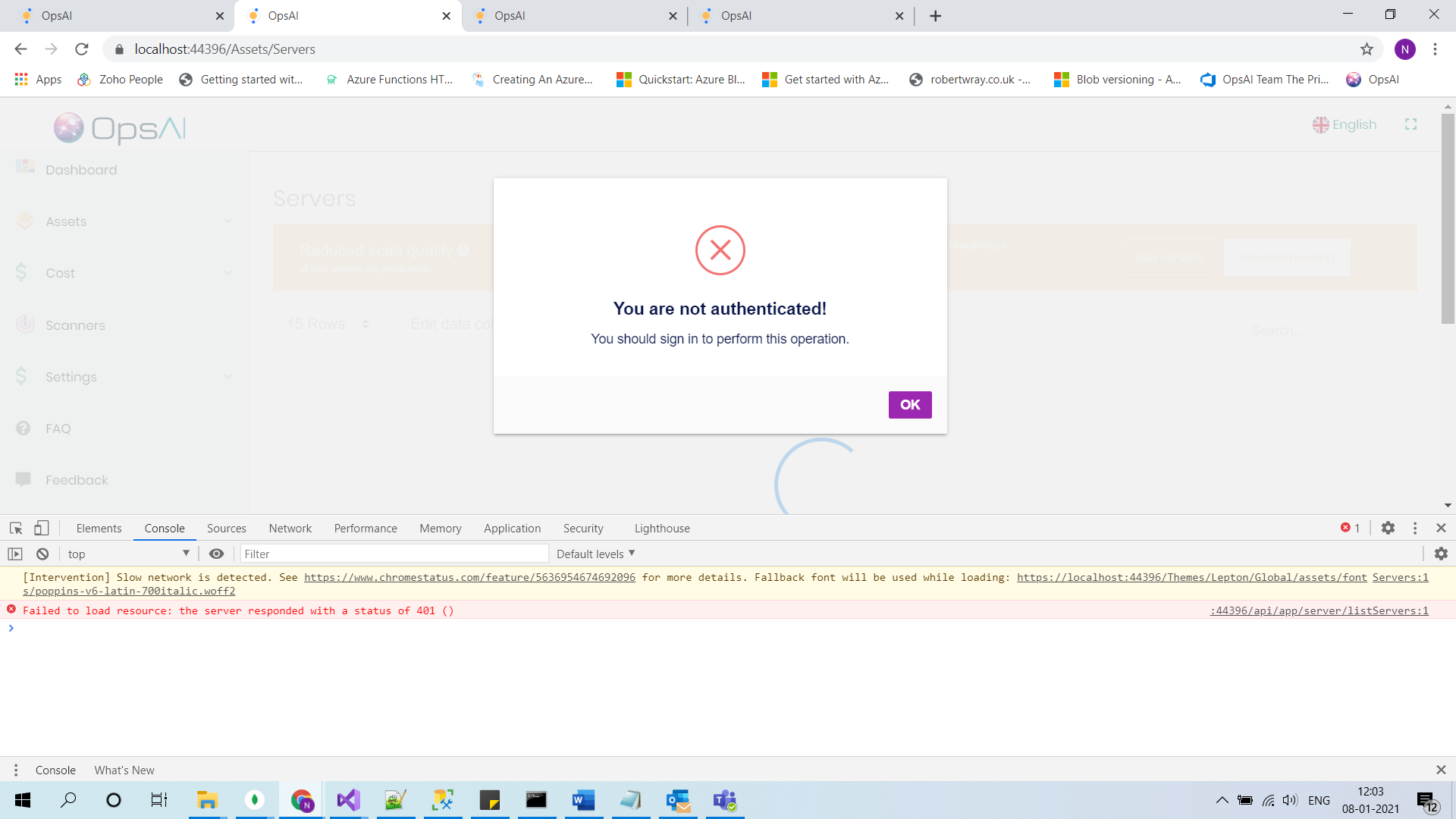 2021-03-26 18:01:49.851 +05:30 [DBG] Security stamp validation failed, rejecting cookie. 2021-03-26 18:01:49.851 +05:30 [INF] AuthenticationScheme: Identity.Application signed out. 2021-03-26 18:01:49.852 +05:30 [INF] AuthenticationScheme: Identity.External signed out. 2021-03-26 18:01:49.852 +05:30 [INF] AuthenticationScheme: Identity.TwoFactorUserId signed out. 2021-03-26 18:01:49.853 +05:30 [INF] Identity.Application was not authenticated. Failure message: No principal. 2021-03-26 18:01:51.758 +05:30 [INF] Identity.Application was not authenticated. Failure message: No principal. 2021-03-26 18:01:51.758 +05:30 [INF] Identity.Application was not authenticated. Failure message: No principal.Security stamp validation failed