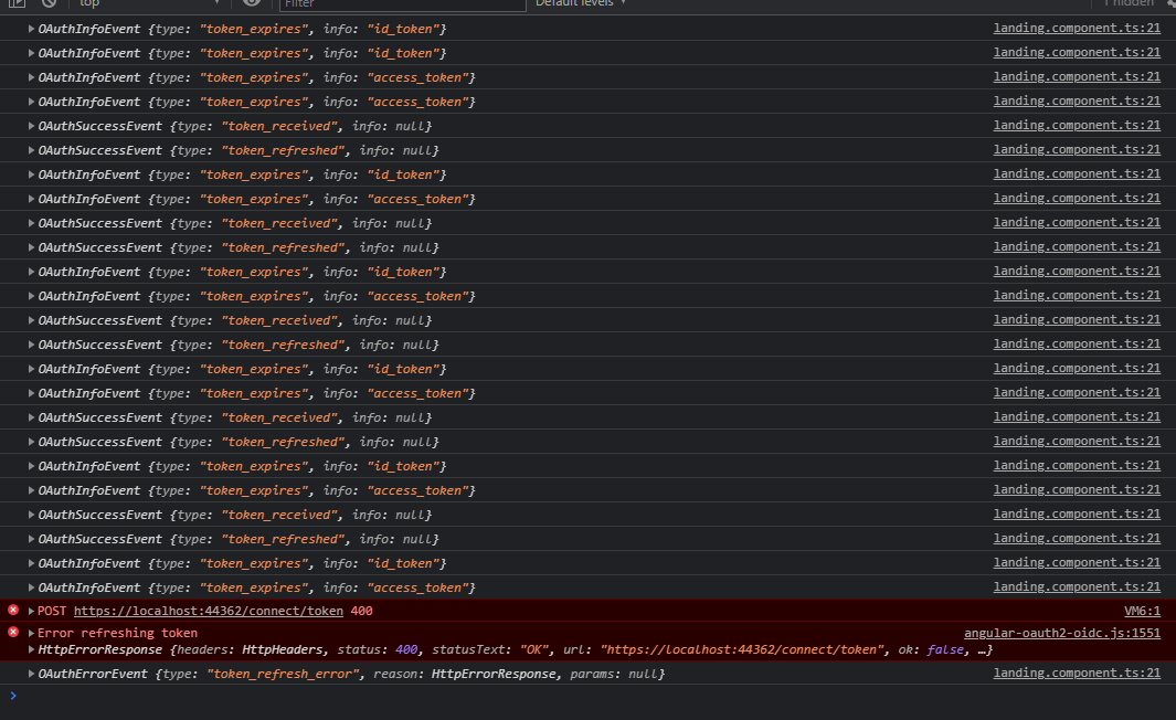 [23:27:53 INF] Request starting HTTP/2 OPTIONS [https://localhost:44362/connect/token](https://localhost:44362/connect/token) - - [23:27:53 INF] CORS policy execution successful. [23:27:53 INF] Request finished HTTP/2 OPTIONS [https://localhost:44362/connect/token](https://localhost:44362/connect/token) - - - 204 - - 0.2743ms [23:27:53 INF] Request starting HTTP/2 POST [https://localhost:44362/connect/token](https://localhost:44362/connect/token) application/x-www-form-urlencoded 160 [23:27:53 INF] CORS policy execution successful. [23:27:53 INF] Successfully validated the token. [23:27:53 DBG] CORS request made for path: /connect/token from origin: [http://localhost:4200](http://localhost:4200) [23:27:53 DBG] CorsPolicyService allowed origin: [http://localhost:4200](http://localhost:4200) [23:27:53 INF] CORS policy execution successful. [23:27:53 DBG] Request path /connect/token matched to endpoint type Token [23:27:53 DBG] Endpoint enabled: Token, successfully created handler: IdentityServer4.Endpoints.TokenEndpoint [23:27:53 INF] Invoking IdentityServer endpoint: IdentityServer4.Endpoints.TokenEndpoint for /connect/token [23:27:53 DBG] Start token request. [23:27:53 DBG] Start client validation [23:27:53 DBG] Start parsing Basic Authentication secret [23:27:53 DBG] Start parsing for secret in post body [23:27:53 DBG] client id without secret found [23:27:53 DBG] Parser found secret: PostBodySecretParser [23:27:53 DBG] Secret id found: Client_App [23:27:53 DBG] client configuration validation for client Client_App succeeded. [23:27:53 DBG] Public Client - skipping secret validation success [23:27:53 DBG] Client validation success [23:27:53 INF] {"ClientId": "Client_App", "AuthenticationMethod": "NoSecret", "Category": "Authentication", "Name": "Client Authentication Success", "EventType": "Success", "Id": 1010, "Message": null, "ActivityId": "80000182-0003-f700-b63f-84710c7967bb", "TimeStamp": "2021-03-31T12:27:53.0000000Z", "ProcessId": 10416, "LocalIpAddress": "127.0.0.1:44362", "RemoteIpAddress": "127.0.0.1", "$type": "ClientAuthenticationSuccessEvent"} [23:27:53 DBG] Start token request validation [23:27:53 DBG] Start validation of refresh token request [23:27:53 DBG] Validation of refresh token request success [23:27:53 INF] Token request validation success, {"ClientId": "Client_App", "ClientName": "Client_App", "GrantType": "refresh_token", "Scopes": null, "AuthorizationCode": "********", "RefreshToken": "****ED42", "UserName": null, "AuthenticationContextReferenceClasses": null, "Tenant": null, "IdP": null, "Raw": {"grant_type": "refresh_token", "scope": "offline_access Client", "refresh_token": "***REDACTED***", "client_id": "Client_App"}, "$type": "TokenRequestValidationLog"} [23:27:53 DBG] Updating refresh token [23:27:53 DBG] Token usage is one-time only. Setting current handle as consumed, and generating new handle [23:27:53 DBG] Created refresh token in store [23:27:53 DBG] Getting claims for identity token for subject: 39fb0cd8-5993-8e42-b1a5-e791f73d1e9f and client: Client_App [23:27:53 INF] {"ClientId": "Client_App", "ClientName": "Client_App", "RedirectUri": null, "Endpoint": "Token", "SubjectId": "39fb0cd8-5993-8e42-b1a5-e791f73d1e9f", "Scopes": "openid Client offline_access", "GrantType": "refresh_token", "Tokens": [{"TokenType": "id_token", "TokenValue": "****4Wmw", "$type": "Token"}, {"TokenType": "refresh_token", "TokenValue": "****62BC", "$type": "Token"}, {"TokenType": "access_token", "TokenValue": "****l3yQ", "$type": "Token"}], "Category": "Token", "Name": "Token Issued Success", "EventType": "Success", "Id": 2000, "Message": null, "ActivityId": "80000182-0003-f700-b63f-84710c7967bb", "TimeStamp": "2021-03-31T12:27:53.0000000Z", "ProcessId": 10416, "LocalIpAddress": "127.0.0.1:44362", "RemoteIpAddress": "127.0.0.1", "$type": "TokenIssuedSuccessEvent"} [23:27:53 DBG] Token request success. [23:27:53 INF] Request finished HTTP/2 POST [https://localhost:44362/connect/token](https://localhost:44362/connect/token) application/x-www-form-urlencoded 160 - 200 - application/json;+charset=UTF-8 123.8776ms [REMOVED MULTIPLE REPEATING TOEKN REFRESH SUCCESS BLOCKS] [23:53:08 INF] Request starting HTTP/2 OPTIONS [https://localhost:44362/connect/token](https://localhost:44362/connect/token) - - [23:53:08 INF] CORS policy execution successful. [23:53:08 INF] Request finished HTTP/2 OPTIONS [https://localhost:44362/connect/token](https://localhost:44362/connect/token) - - - 204 - - 0.3562ms [23:53:08 INF] Request starting HTTP/2 POST [https://localhost:44362/connect/token](https://localhost:44362/connect/token) application/x-www-form-urlencoded 160 [23:53:08 INF] CORS policy execution successful. [23:53:08 INF] Successfully validated the token. [23:53:08 DBG] CORS request made for path: /connect/token from origin: [http://localhost:4200](http://localhost:4200) [23:53:08 DBG] CorsPolicyService allowed origin: [http://localhost:4200](http://localhost:4200) [23:53:08 INF] CORS policy execution successful. [23:53:08 DBG] Request path /connect/token matched to endpoint type Token [23:53:08 DBG] Endpoint enabled: Token, successfully created handler: IdentityServer4.Endpoints.TokenEndpoint [23:53:08 INF] Invoking IdentityServer endpoint: IdentityServer4.Endpoints.TokenEndpoint for /connect/token [23:53:08 DBG] Start token request. [23:53:08 DBG] Start client validation [23:53:08 DBG] Start parsing Basic Authentication secret [23:53:08 DBG] Start parsing for secret in post body [23:53:08 DBG] client id without secret found [23:53:08 DBG] Parser found secret: PostBodySecretParser [23:53:08 DBG] Secret id found: Client_App [23:53:08 DBG] client configuration validation for client Client_App succeeded. [23:53:08 DBG] Public Client - skipping secret validation success [23:53:08 DBG] Client validation success [23:53:08 INF] {"ClientId": "Client_App", "AuthenticationMethod": "NoSecret", "Category": "Authentication", "Name": "Client Authentication Success", "EventType": "Success", "Id": 101