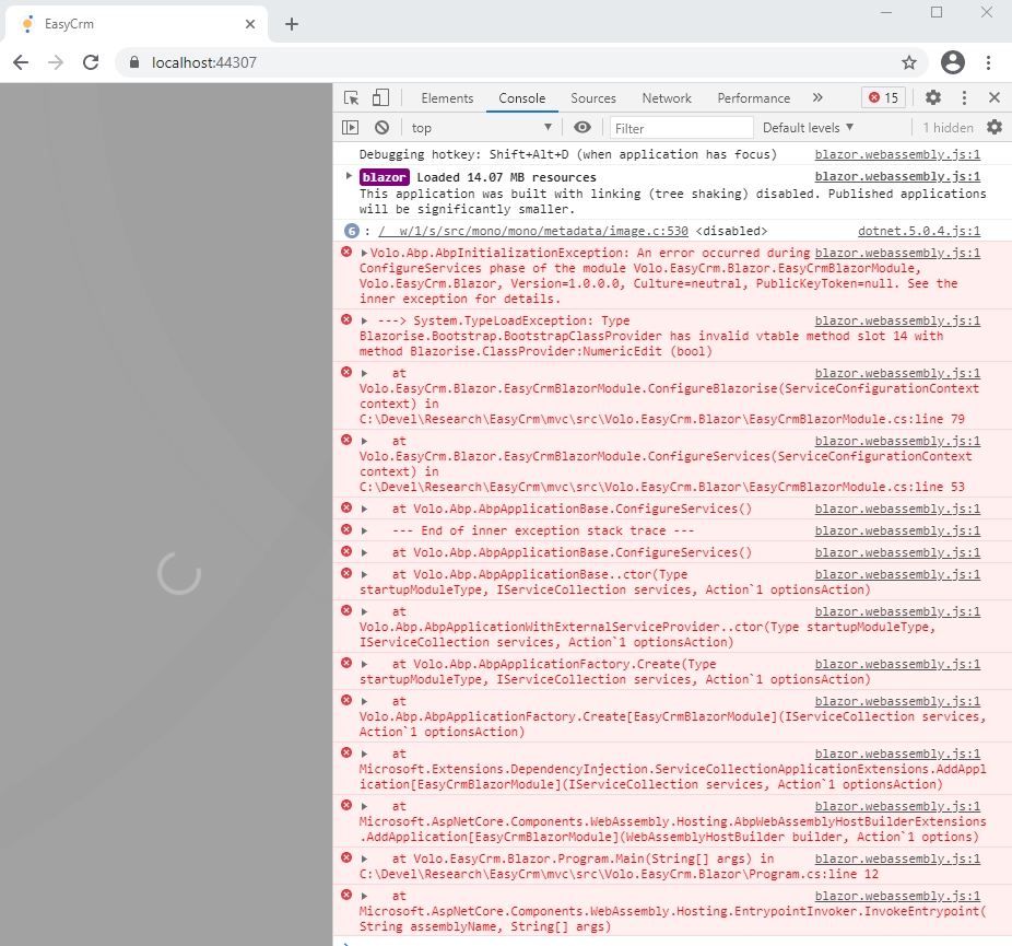 blazor.webassembly.js:1 at Volo.EasyCrm.Blazor.EasyCrmBlazorModule.ConfigureServices(ServiceConfigurationContext context) in C:\Devel\Research\EasyCrm\mvc\src\Volo.EasyCrm.Blazor\EasyCrmBlazorModule.cs:line 53