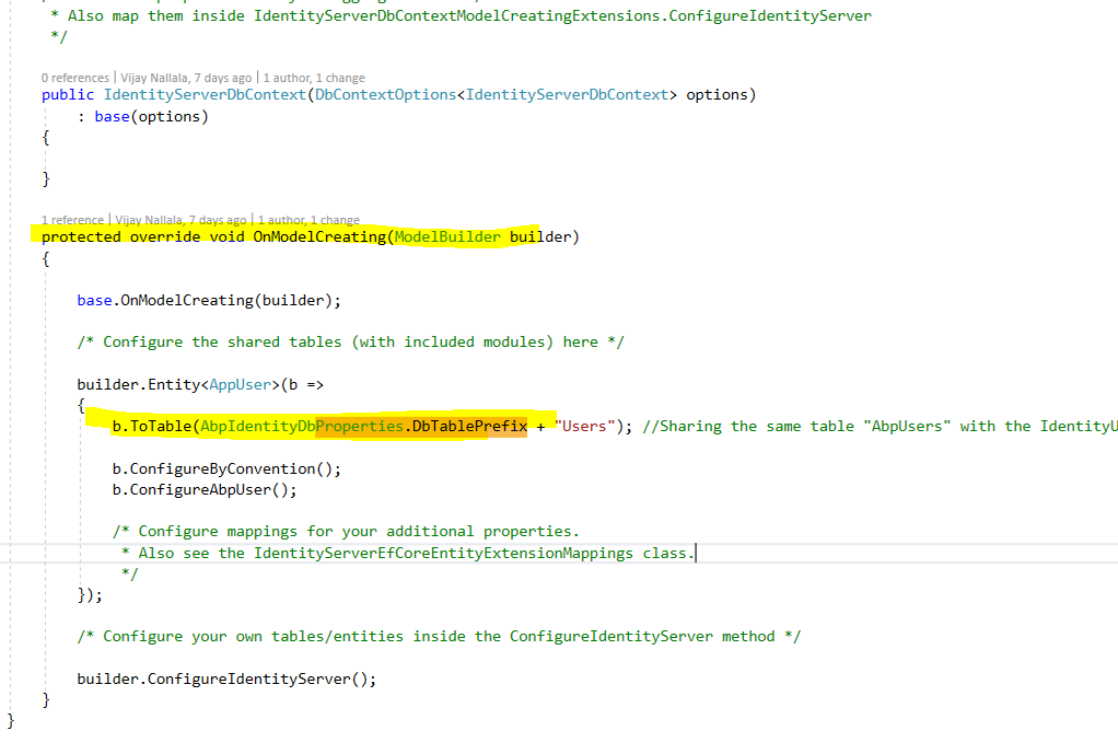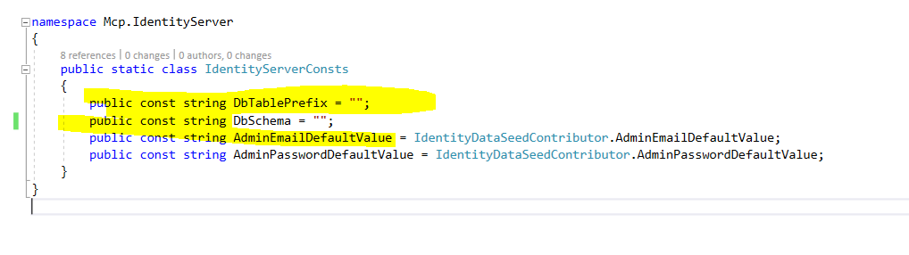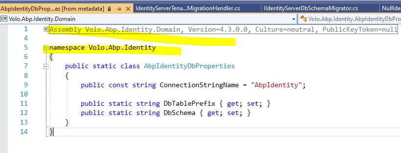so both - prefix propeties are not same and not aplied while run the DB, we need this should be set and get while calling all namespace Volo.Abp.Identity { public static class AbpIdentityDbProperties { public const string ConnectionStringName = "AbpIdentity";