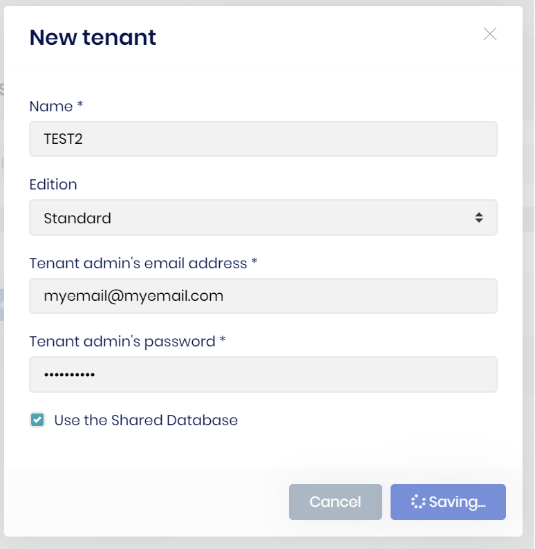 4. I created a new tenant in the SAAS module, "TEST", "myemail@myemail.com", "mypa$$word"
