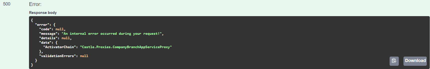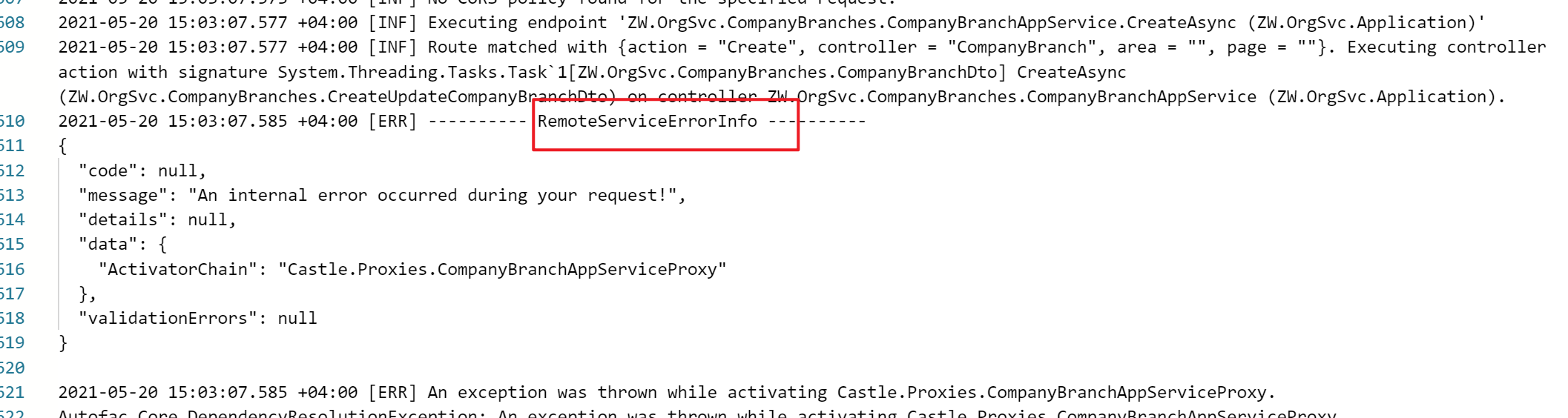 { "userId": "dcf37353-fc1d-0bb5-e820-39fc86c50a1e", "userName": "admin", "tenantId": null, "impersonatorUserId": null, "impersonatorTenantId": null, "executionTime": "2021-06-01T07:19:20.16Z", "executionDuration": 5, "clientIpAddress": "::1", "clientName": null, "browserInfo": "Mozilla/5.0 (Windows NT 10.0; Win64; x64) AppleWebKit/537.36 (KHTML, like Gecko) Chrome/90.0.4430.212 Safari/537.36 Edg/90.0.818.66", "httpMethod": "POST", "url": "/api/app/company-branch", "exceptions": "", "comments": "", "httpStatusCode": 500, "applicationName": null, "correlationId": "6625a18b1f1747a7a1fdb7e7664ccfab", "entityChanges": [], "actions": [], "id": "e6ecd896-becd-ad49-8f8c-39fcd89dc565", "extraProperties": {} }