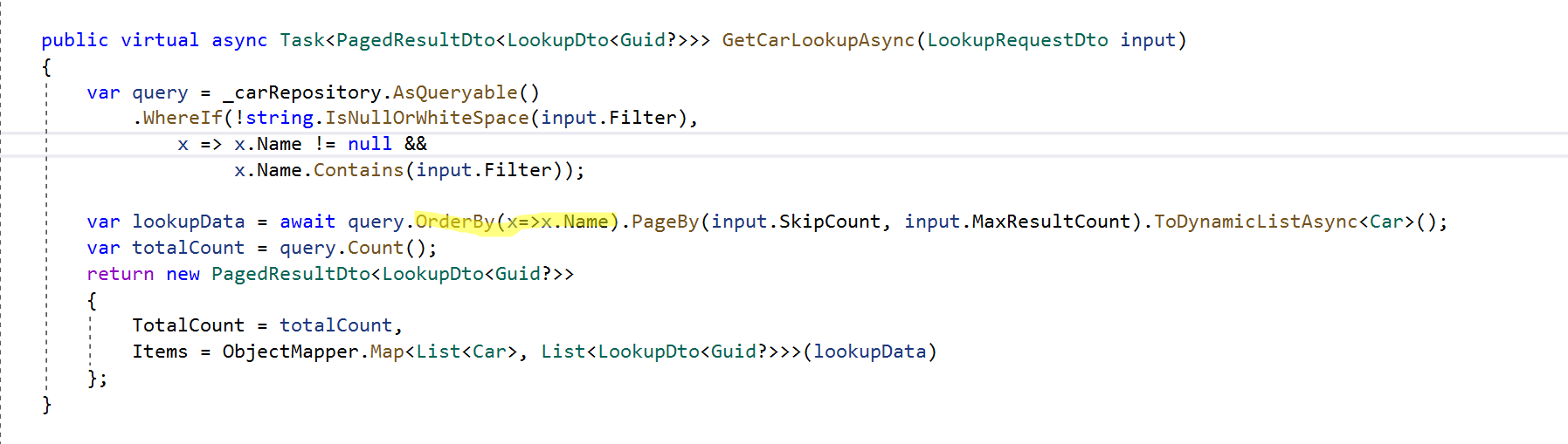 I don't want to implement another repsoitory or alter the automatically generated ABP suite code, can this be raised as an issue as it makes no sense to have no sort on LookupDto results. LookupDto only have two fields, Key (Guid) and DisplayName - the value is what the end user sees and therefore LookupDto should by default be sorted by the DisplayName.