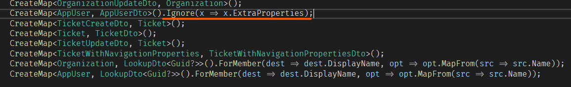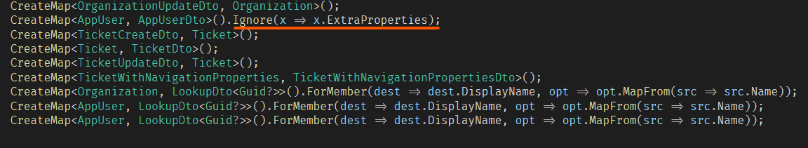 CreateMap<AppUser, AppUserDto>().Ignore(x => x.ExtraProperties); -