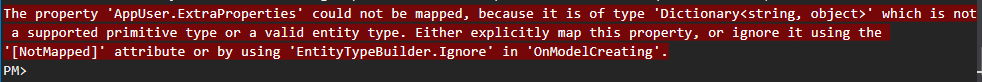 AppUser.ExtraPropertiesis a new property. And it's not mapped in your application. So you can basically ignore this property mapping. You did a mapping as below:CreateMap<AppUser, AppUserDto>();change it