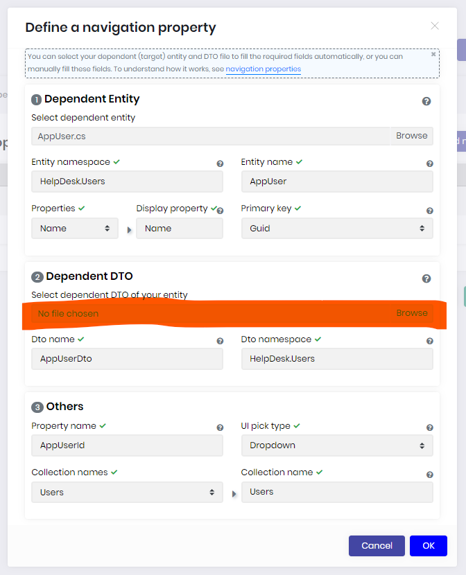 DTO. Go to BookStoreApplicationAutoMapperProfile.cs and add the below line:CreateMap<AppUser, AppUserDto>().Ignore(x => x.ExtraProperties);Now we can pick this DTO from navigatin property modal