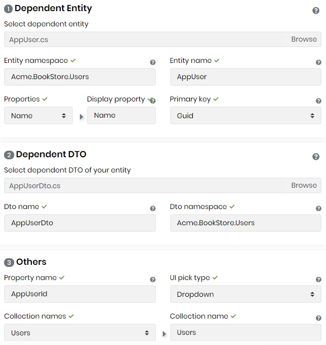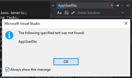 Acme.BookStore.Application.Contracts\EntityNamePlural\But AppUser seems like database table name, not an entity name! Did you name the user entity AppUser? If you name it AppUser then Suite generatesAppUserDtoand it's being used inIAppUserAppService.csOpen your Visual Studio and search forAppUserDtoinIAppUserAppServiceTask<AppUserDto> CreateAsync(AppUserCreateDto input); -
