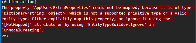I followed your previous instructions, however when I try to add a migration I get the following error. I think I need to somehow ignore the ExtraProperties for the navigation LookupDtos.