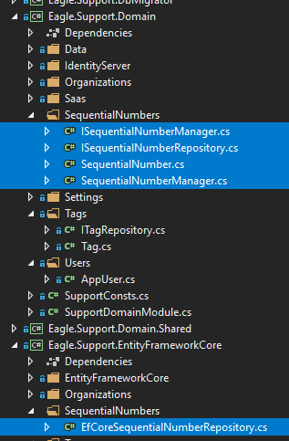 EfCoreSequentialNumberRepositorybelong in the Domain project.I guess the next step is to add the following DBContext items create and delplay a new migration.