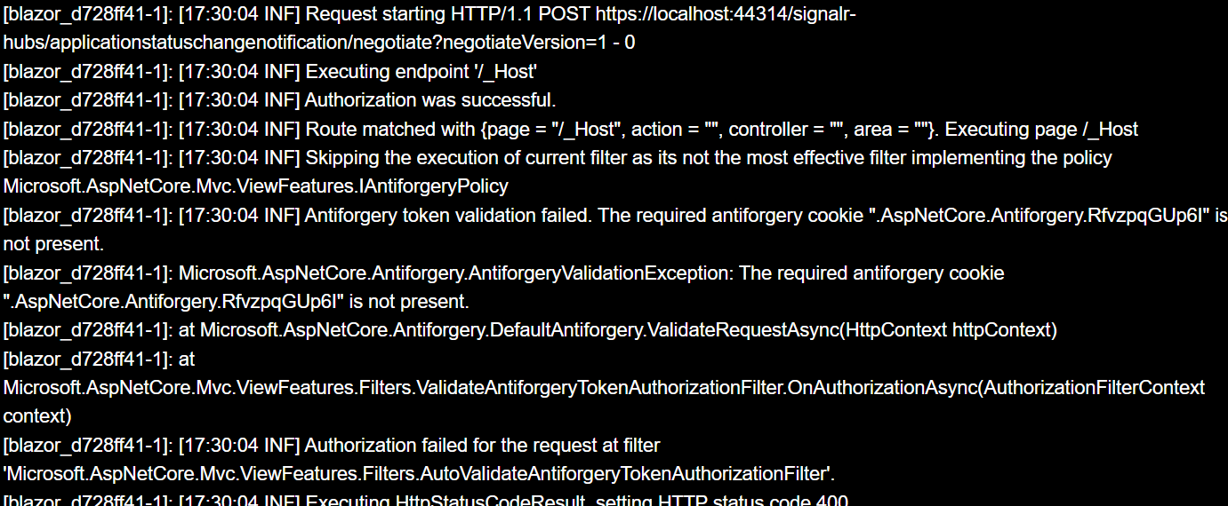 We have a microservice project set up with blazor server front end project. We are trying to send notificatio on status change using signalR. We have created a hub inheriting from AbpHub and followed Microsofot's documentation to connect to hub from blazor server project. We are getting "Antiforgery token validation failed. The required antiforgery cookie ".AspNetCore.Antiforgery.RfvzpqGUp6I" is not present." when hubConnection.StartAsync() is invoked.