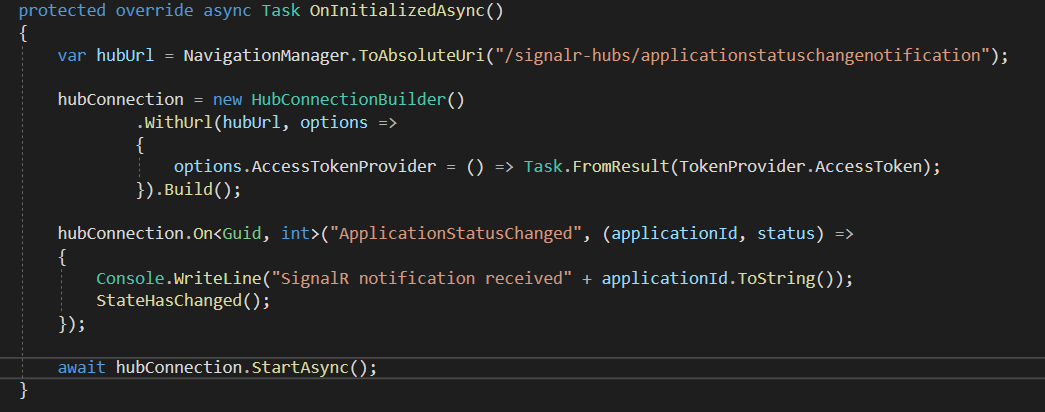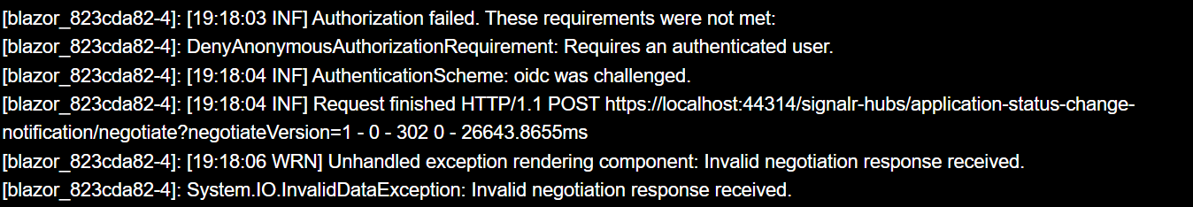 Hi, It is a microservice template project with blazor server front end. We just created a hub in blazor server project and implemented hub connection from a razor page using "Microsoft.AspNetCore.SignalR.Client" package. Please find the signalR hub connection code below. "await hubConnection.StartAsync();" would invoke the signalR negotiate endpoint POST https://localhost:44314/signalr-hubs/applicationstatuschangenotification/negotiate?negotiateVersion=1 - 0