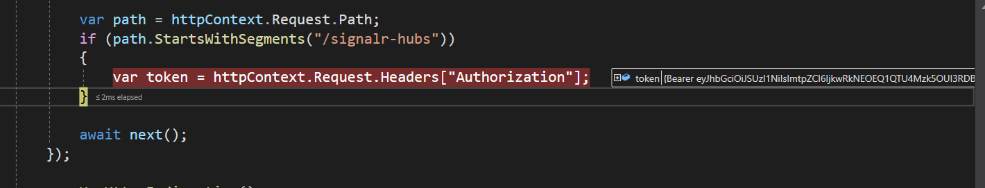 Can you check these? https://docs.microsoft.com/en-us/aspnet/core/signalr/authn-and-authz?view=aspnetcore-6.0#built-in-jwt-authentication https://docs.microsoft.com/en-us/aspnet/core/signalr/authn-and-authz?view=aspnetcore-6.0#identity-server-jwt-authentication