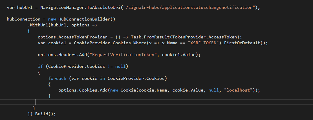 Hi, I have already tried passing the RequestVerificationToken and the cookies to signalR connection. But it is giving the same error. ".AspNetCore.Antiforgery.RfvzpqGUp6I" is not present." This cookie ".AspNetCore.Antiforgery.RfvzpqGUp6I" doesn't exist in the browser cookies. Instead there is a similar cookie with name ".AspNetCore.Antiforgery.dHbfFikoQ1Y".