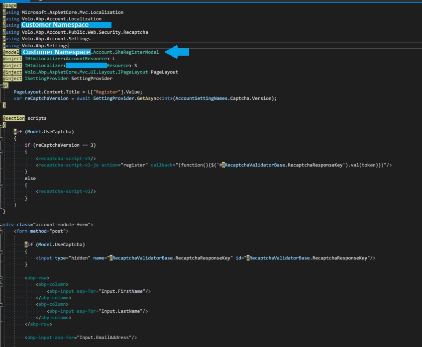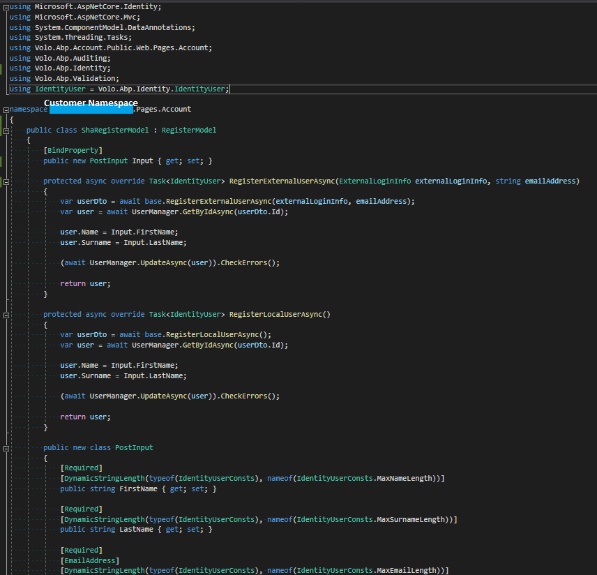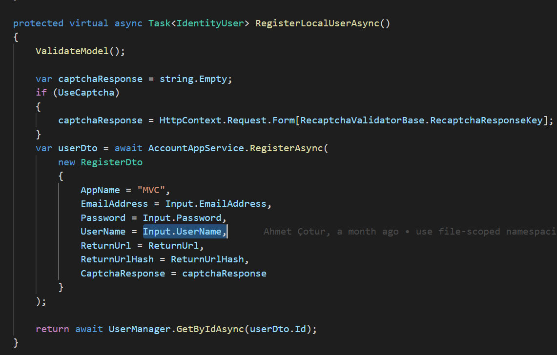 protected async override Task<IdentityUser> RegisterLocalUserAsync() { var userDto = await RegisterLocalUser2Async(); var user = await UserManager.GetByIdAsync(userDto.Id); user.Name = Input.FirstName; user.Surname = Input.LastName; (await UserManager.UpdateAsync(user)).CheckErrors(); return user; } protected virtual async Task<IdentityUser> RegisterLocalUser2Async() { ValidateModel(); var captchaResponse = string.Empty; if (UseCaptcha) { captchaResponse = HttpContext.Request.Form[RecaptchaValidatorBase.RecaptchaResponseKey]; } var userDto = await AccountAppService.RegisterAsync( new RegisterDto { AppName = "MVC", EmailAddress = Input.EmailAddress, Password = Input.Password, UserName = Input.FirstName + Input.LastName, ReturnUrl = ReturnUrl, ReturnUrlHash = ReturnUrlHash, CaptchaResponse = captchaResponse } ); return await UserManager.GetByIdAsync(userDto.Id); } -