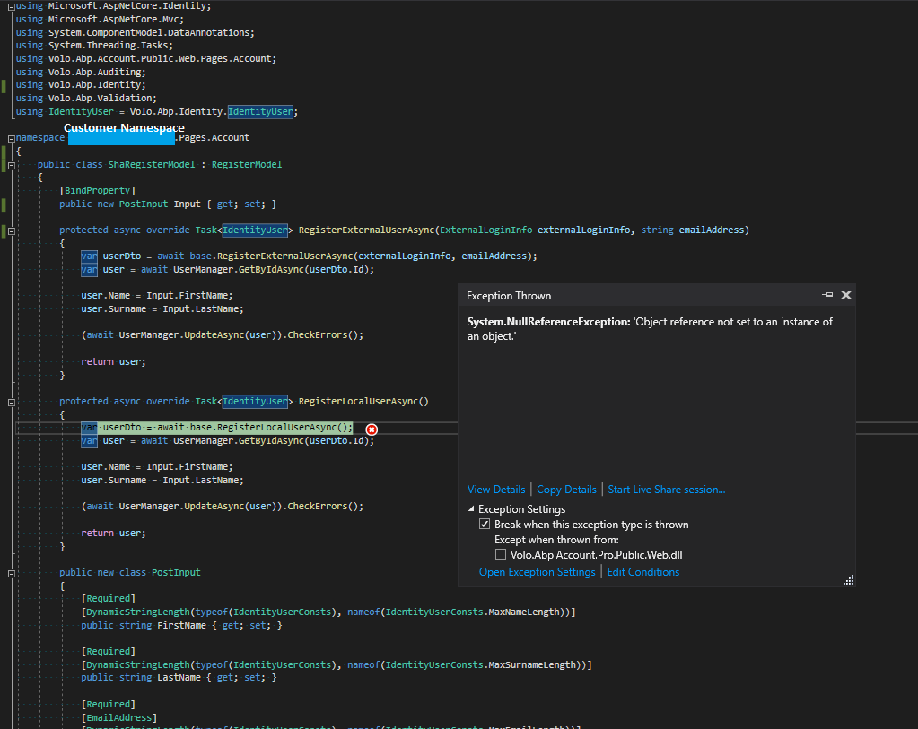 The example you've provided fixes the exception itself but this solution would mean that I'd need to copy / duplicate the code from the RegisterModel (or any other ABP model I want to override) in order to override that method. That is not ideal if I need to override lots of different models and methods. I will definitely need to do this in the future across a range of different razor pages related to the Login and Registration workflows.