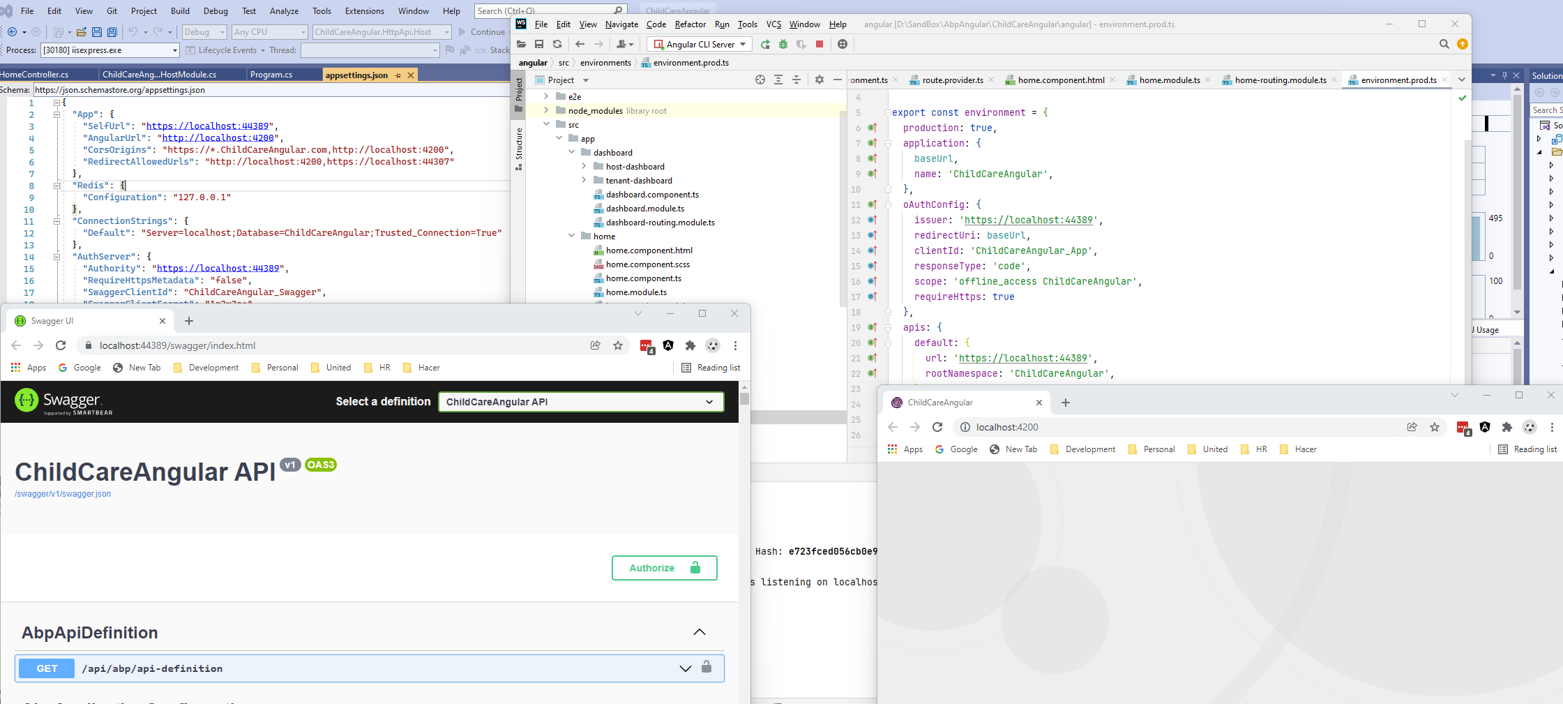 • Steps to reproduce the issue: I have created a brand new app using the abp suite. Created one simple entity no navigation properties. Generated and compiled the code. The Http.host file solution works and swager comes up with no issue. (https://localhost:44344/swagger/index.html) Started the .Blazor Application and stays in the cover-spin never moves forward to the login as the documentation says. (https://localhost:44307/) The appsettings for the .blazor shows as : }, "AuthServer": { "Authority": "https://localhost:44344", "ClientId": "ChildCarePal_Blazor", "ResponseType": "code" }, "RemoteServices": { "Default": { "BaseUrl": "https://localhost:44344" } }, "AbpCli": { "Bundle": { "Mode": "BundleAndMinify", /* Options: None, Bundle, BundleAndMinify / "Name": "global", "Parameters": { "LeptonTheme.Style": "Style6", / Options: Style1, Style2... Style6 */ "LeptonTheme.ChangeStyleDynamically": "true" } } } }