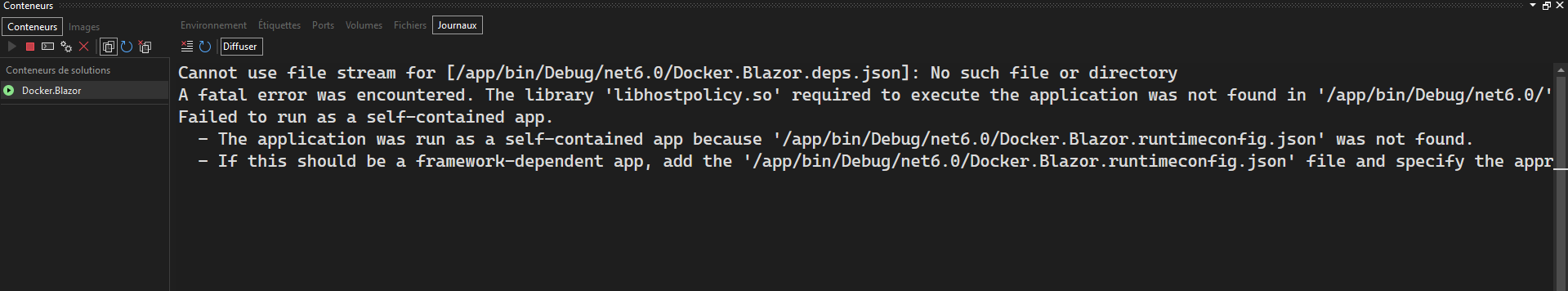 • Exception message and stack trace: Cannot use file stream for [/app/bin/Debug/net6.0/Docker.Blazor.deps.json]: No such file or directory A fatal error was encountered. The library 'libhostpolicy.so' required to execute the application was not found in '/app/bin/Debug/net6.0/'. Failed to run as a self-contained app.