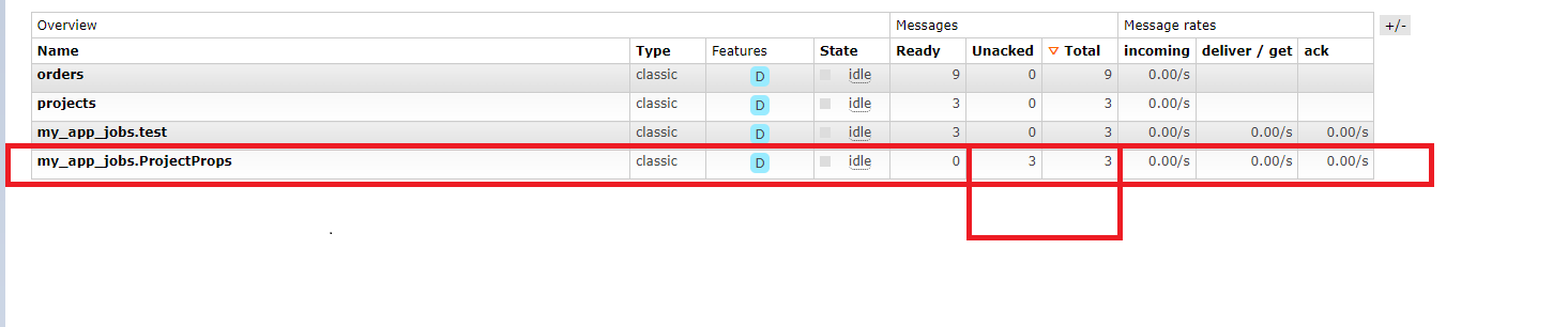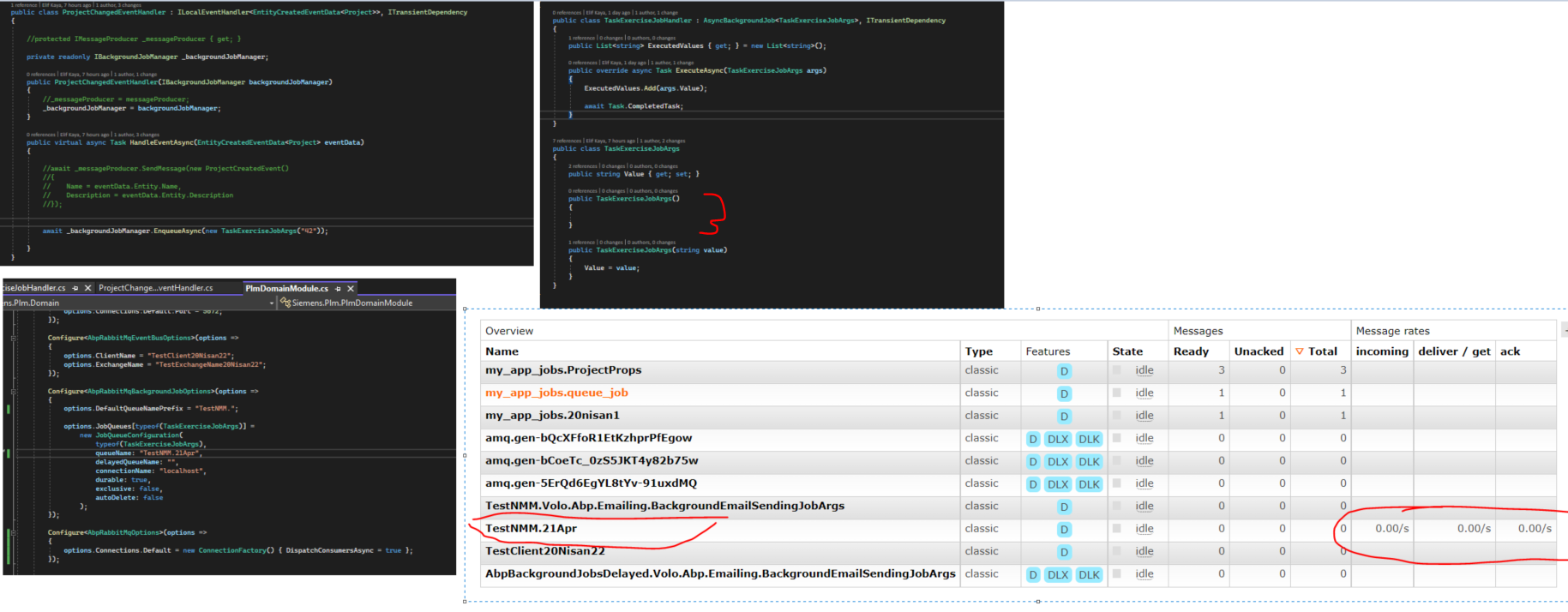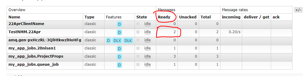 In the last example highlighted in red below, you can see that it remains "Unacked". There is no problem when I give my own integration directly to RabbitMq without using ABP integration. But when I use ABP, the status stays "Unacked" on runtime. It should be "Ready". When I stop debugging on Visual Studio, it goes into Ready state. This issue only happens when I use ABP integration.