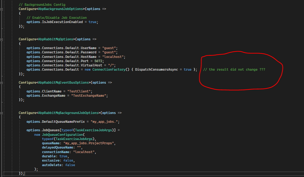 options.Connections.Default = new ConnectionFactory() { DispatchConsumersAsync = true }; // the result did not change ???