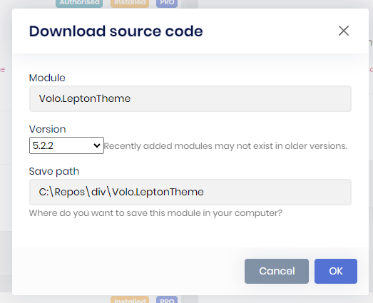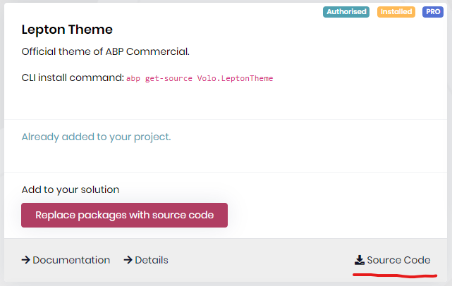 Well... solved it for me by using a different approach. abp get-source Volo.LeptonTheme