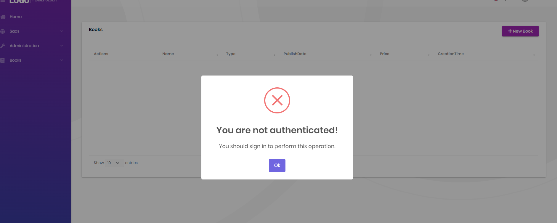 I was following the instructions in the tutorial (section: Authorization), Once Applied to the BookStoreAppService the policies, //GetPolicyName = BookStorePermissions.Books.Default; //GetListPolicyName = BookStorePermissions.Books.Default; //CreatePolicyName = BookStorePermissions.Books.Create; //UpdatePolicyName = BookStorePermissions.Books.Edit; //DeletePolicyName = BookStorePermissions.Books.Delete;