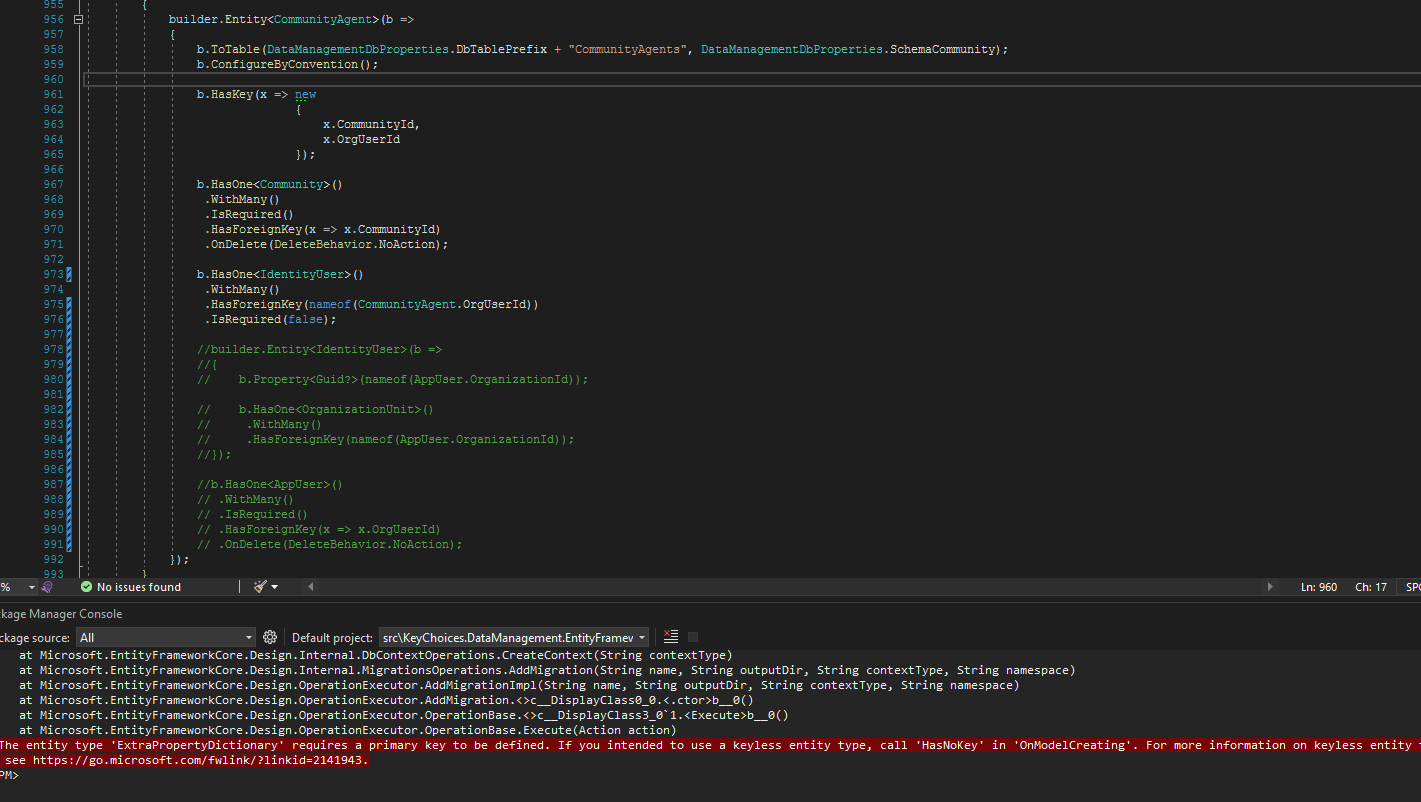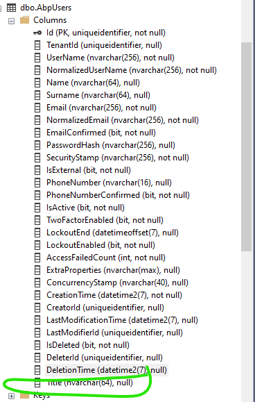 dbo.AbpUsers does have an extra column (ExtraProperty), "Title" that may be the root of the problem. I really need very specific help here, a redirection to projects DocumentationSamples or EfCoreMigrationDemo isn't going to help me because I've already pulled my hair out reviewing those projects. thank you very much!