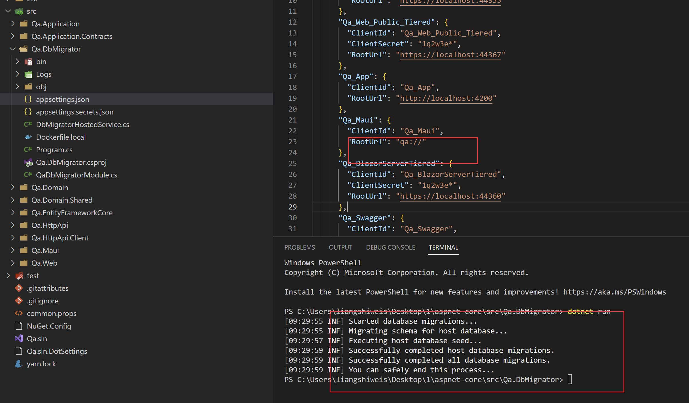 If I ignore the error and attempt to run the DBMigrator I get an exception (BusinessRuleException) indicating that there is an invalid Uri. The Uri that is invalid is maui_test://. I put a breakpoint in at the check for the Business Rule Exception and bypass the error and got the DBMigrator to run. However when I try to run the app with either the MAUI project or the Web project as the startup project I get an error saying that the HttpApi.Client.dll cannot be found.