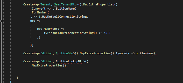 CreateMap<Tenant, SaasTenantDto>() .MapExtraProperties() .Ignore(t => t.EditionName) .ForMember( t => t.HasDefaultConnectionString, opt => { opt.MapFrom(t => t.FindDefaultConnectionString() != null ); } ); CreateMap<Edition, EditionDto>() .MapExtraProperties() .Ignore(x => x.PlanName); CreateMap<Edition, EditionLookupDto>() .MapExtraProperties(); -