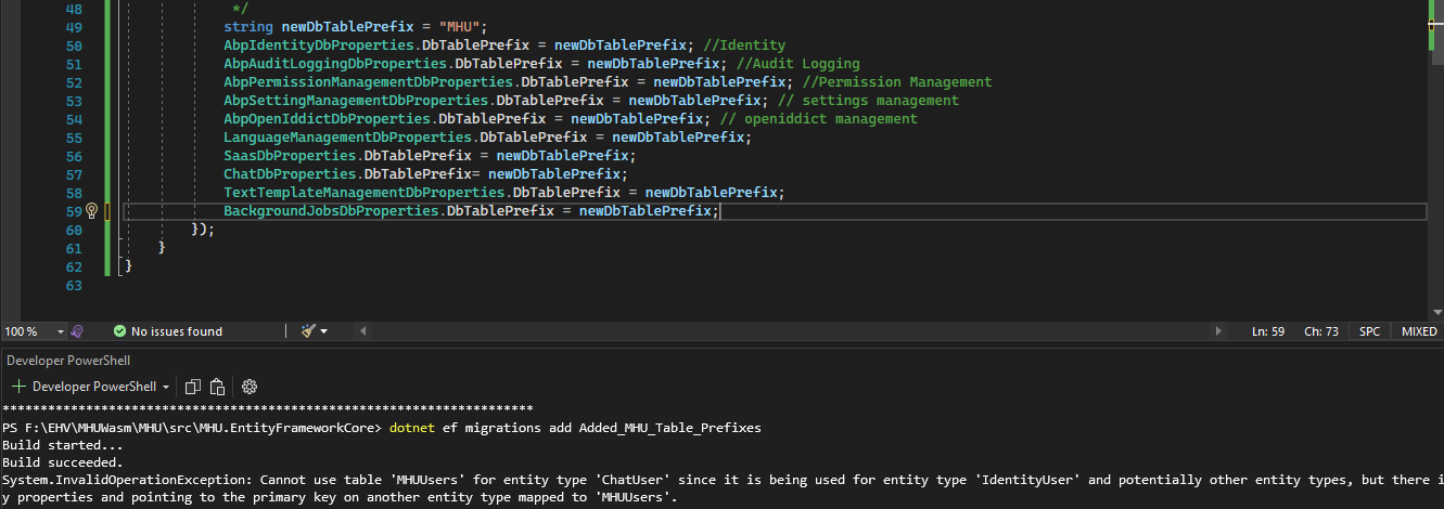 • Steps to reproduce the issue: Create a new solution with ABP Suite, install chat module, add table prefixes for identity / chat etc, add migration.
