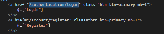 I've tried to reproduce your issue via the Blazor template. It seems good Account/Login and Account/Register . However, Authentication\Login is the wrong way.