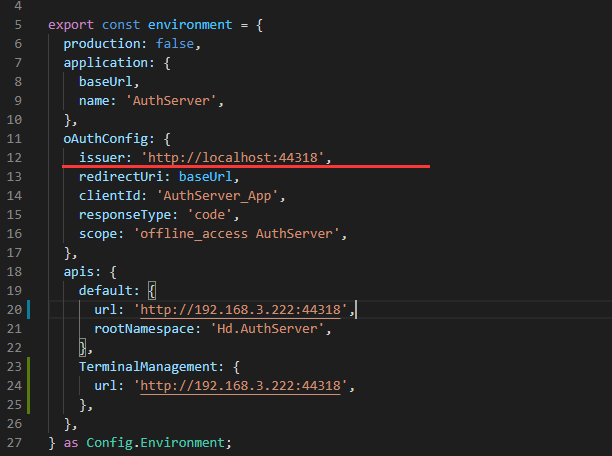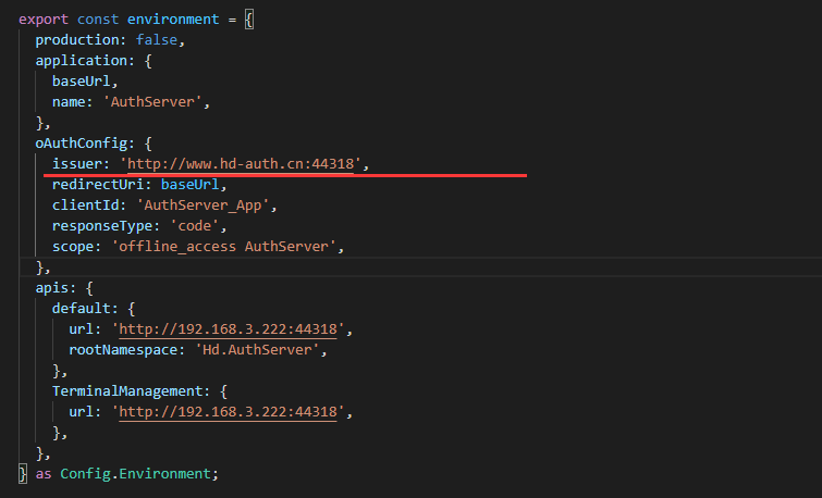 oAuthConfigas shown below:oAuthConfig: { issuer: 'http://www.hd-auth.cn:44318', clientId: 'AuthServer_App', dummyClientSecret: 'place client secret here', scope: 'AuthServer', requireHttps: false, }, -