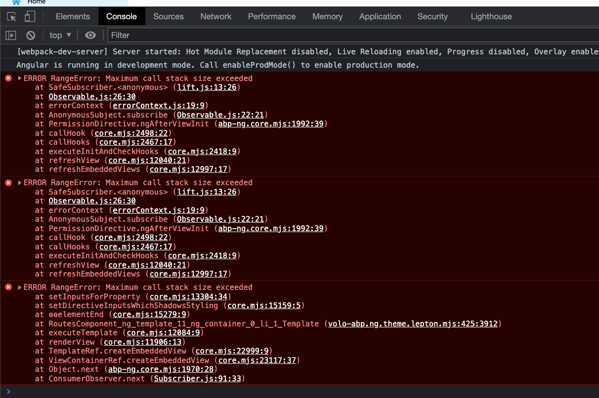 default-src_app_shared_shared_module_ts.js:1 ERROR RangeError: Maximum call stack size exceeded at SafeSubscriber.<anonymous> (lift.js:13:26) at Observable.js:26:30 at errorContext (errorContext.js:19:9) at AnonymousSubject.subscribe (Observable.js:22:21) at PermissionDirective.ngAfterViewInit (abp-ng.core.mjs:1992:39) at callHook (core.mjs:2498:22) at callHooks (core.mjs:2467:17) at executeInitAndCheckHooks (core.mjs:2418:9) at refreshView (core.mjs:12040:21) at refreshEmbeddedViews (core.mjs:12997:17)