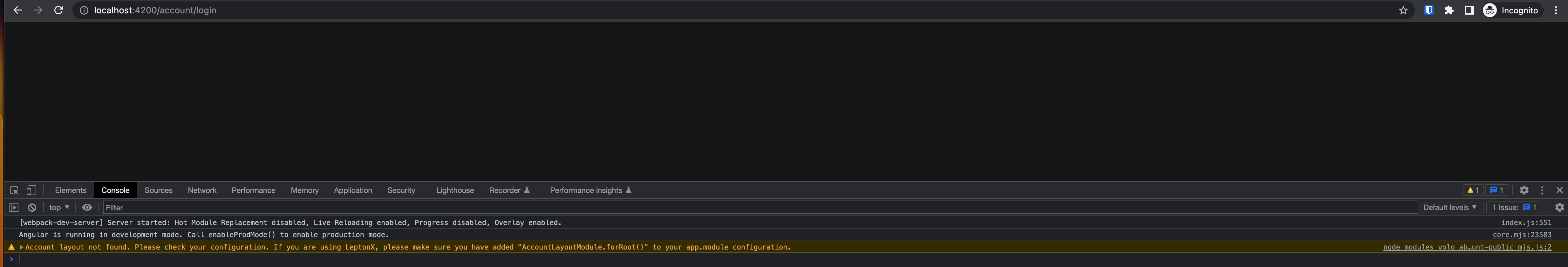 // app.module.ts import { AccountLayoutModule} from '@volosoft/abp.ng.theme.lepton-x/account' @NgModule({ // ... imports: [ // ... AccountLayoutModule.forRoot(), // ... ], // ... }) export class AppModule {}if you are using a backend-based Auth-flow, the Auth server must be accessible.
