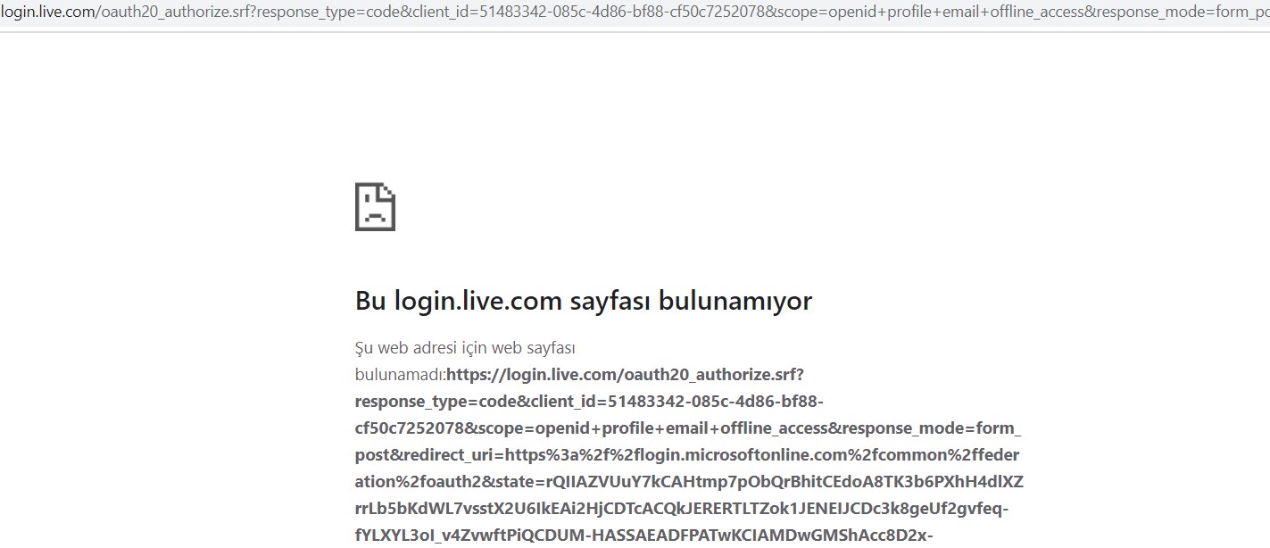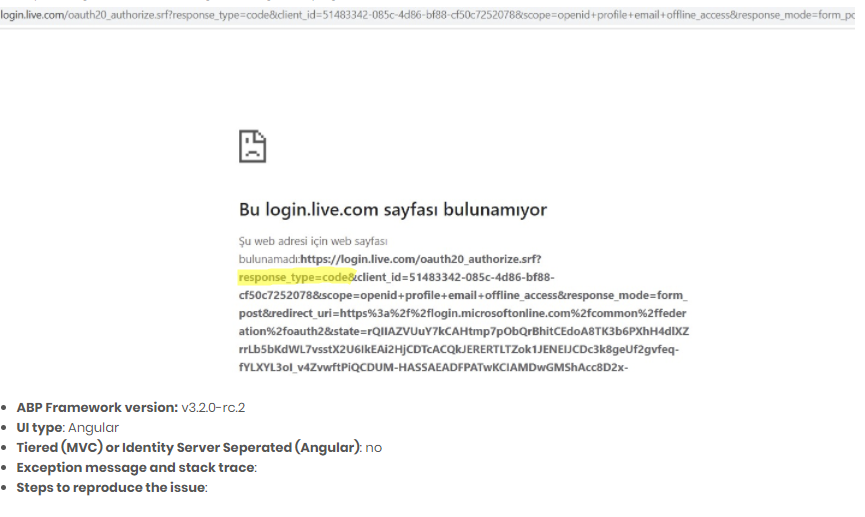 I did the above code settings and the settings in the azure portal as you said. Clicking the Azure Ad Open Id button redirects me to the microsoft login page, after entering the username, the password screen should appear, but I get the login.live.com page not found error. But if I have logged into the microsoft site before, it will let me in directly. I do not get an error.
