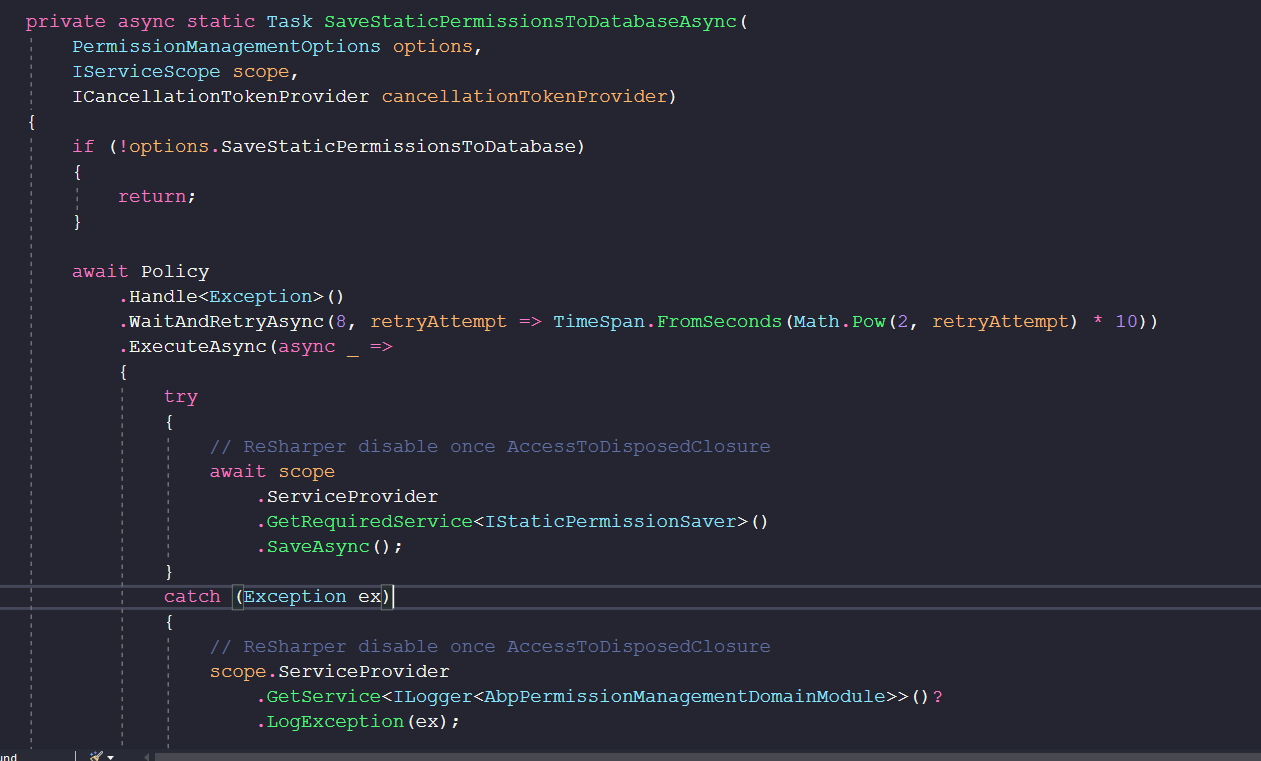 But I couldn't see the same approach on Settings part, but I know Settings also has a definitionProvider but I couldn't understand when these configurations persisting ? How settings module handle that ? By the way what is the difference between SaveStaticPermissionsToDatabaseAsync or InitializeDynamicPermissions (these are also included in feature side, too ) persistence. I couldn't see any documentation about these topics . But we need to understand how this system works and then we can implement for our own module. We want to understand the design of these approaches overall, Can you help ?