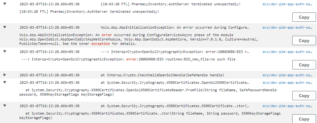 | 3/2/2023, 3:33:19 PM | [10:03:19 FTL] PharmacyInventory.AuthServer terminated unexpectedly! | dev-pim-app-auth-service | | -------------------- | -------------------------------------------------------------------- | ------------------------ | | 3/2/2023, 3:33:19 PM | Volo.Abp.AbpInitializationException: An error occurred during ConfigureServicesAsync phase of the module Volo.Abp.OpenIddict.AbpOpenIddictAspNetCoreModule, Volo.Abp.OpenIddict.AspNetCore, Version=7.0.1.0, Culture=neutral, PublicKeyToken=null. See the inner exception for details. | dev-pim-app-auth-service | | 3/2/2023, 3:33:19 PM | ---> System.IO.FileNotFoundException: Signing Certificate couldn't found: /app/authserver.pfx | dev-pim-app-auth-service | | 3/2/2023, 3:33:19 PM | at PharmacyInventory.AuthServer.PharmacyInventoryAuthServerModule.GetSigningCertificate(IWebHostEnvironment hostingEnv, IConfiguration configuration) in /src/apps/auth-server/src/PharmacyInventory.AuthServer/PharmacyInventoryAuthServerModule.cs:line 336 | |