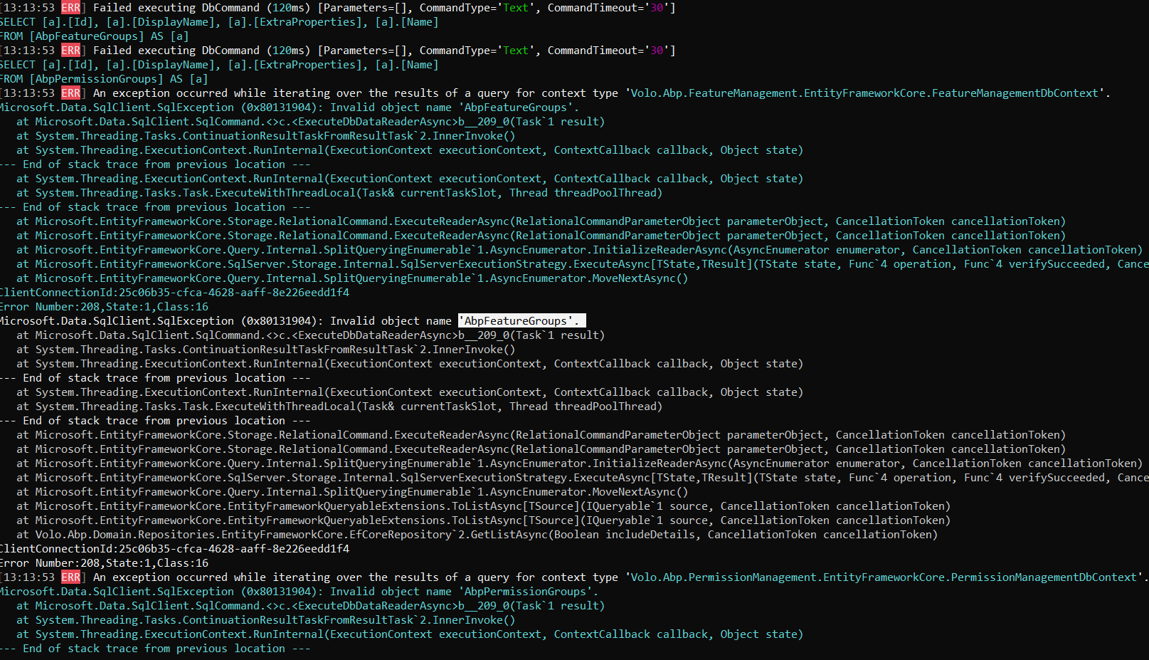 After update all packages and make a migration we faced database missing tables (AbPFeatureGroups,AbpPermissionGroups) and these tables weren't exist in the old version Attached error image:
