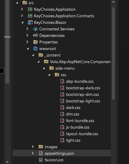 when following these directions ... "have to be added under wwwroot/_content/Volo.Abp.AspNetCore.Components.Web.LeptonXTheme/side-menu/css/ folder for switching to your custom theme properly when selected." I am getting the following exception. I realize that this is because they have the same name as the NuGet files. this works perfectly in MVC and I would like to retain the same file names (theme name) here as well. Is there any way around this error while still keeping with the names Dark & Light. I also realize I can utilize the source theme project, but I'd rather keep things simple like what works in MVC. Thank you!