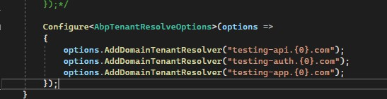 Hi mahmut! Beside of that, I realized that the code only resolve tenant with a fixed suffix domain. For example: testing-app.{0}.com Could you please guild me how to configure resolve tenant with whole domain? For example: testing-app.{0}
